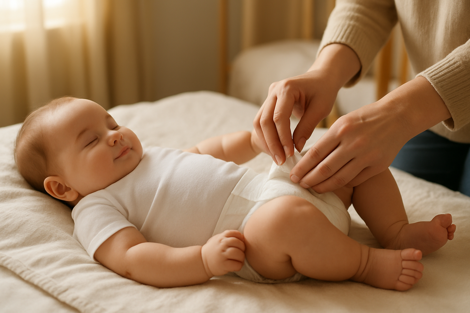 기저귀를 채울 때, 다리를 억지로 펴거나 좁게 모으는 동작은 관절 탈구를 유발할 수 있으므로 주의해야 합니다. 또한, 포대기 사용 시에도 너무 꽉 조이지 않도록 조절해야 해요.
