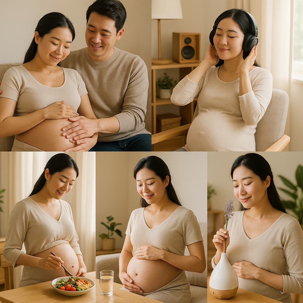 - 자연향기 노출: 꽃향기, 허브, 과일 향 등 은은한 향기를 간헐적으로 맡기 → 산모의 후각 인지가 양수와 연관되어 태아에게 전달