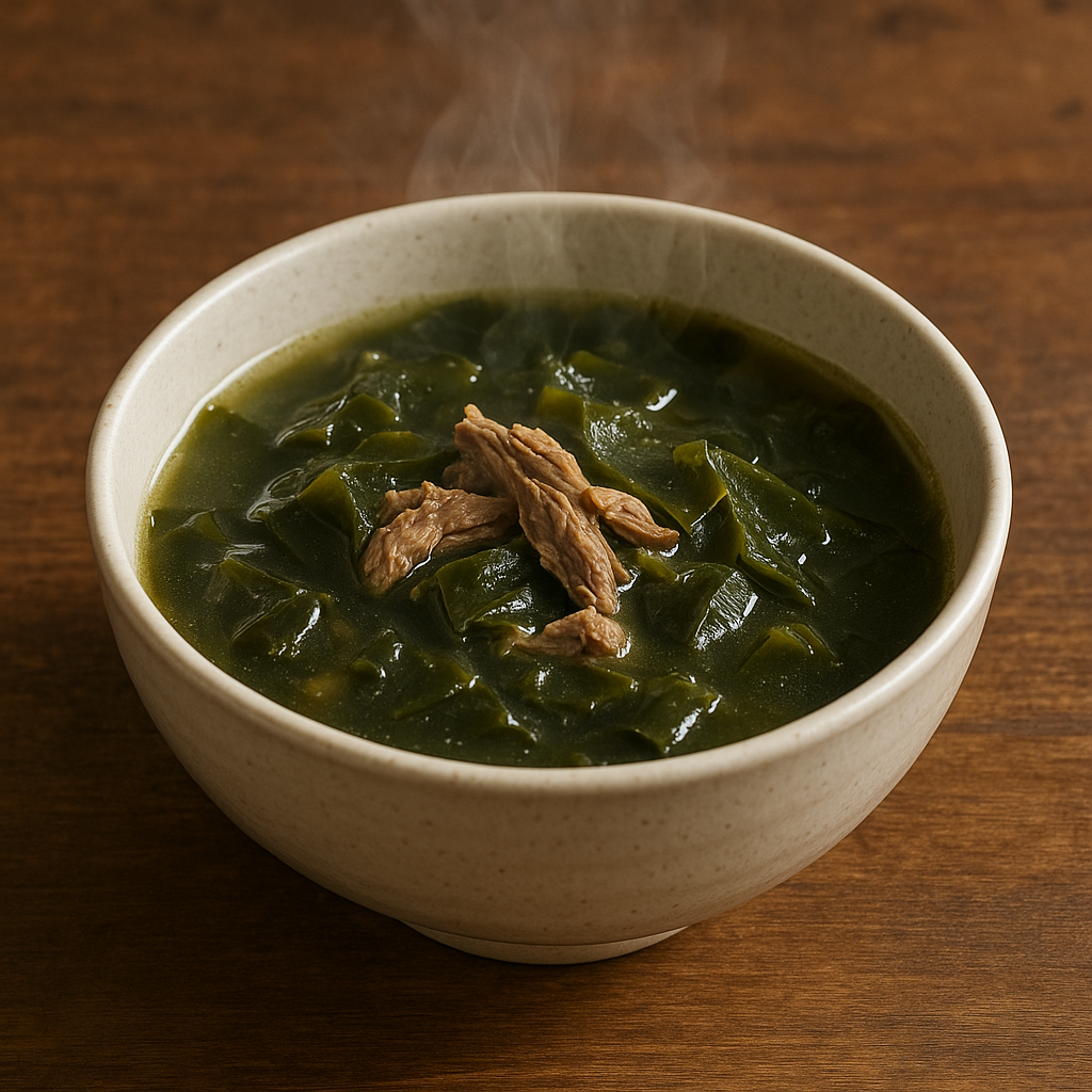 - 재료 (2인분 기준): 불린 미역 한 줌, 다진 쇠고기 100g, 참기름 1큰술, 국간장 1큰술, 다진 마늘 약간, 물 5컵
