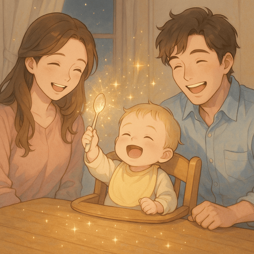 숟가락이 춤추자 아기의 웃음이 따라 춤을 췄고, 식탁 위는 별빛처럼 반짝였답니다.
